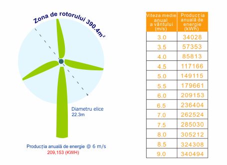 - Diametrul rotorului 22,3 m are o putere de 60kw @ 9m / s